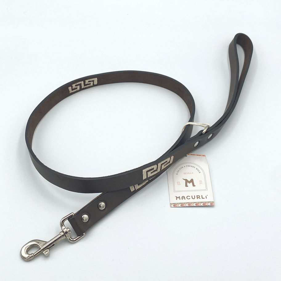 Håndlavet hundesnor til hunde, i brunt læder og trykt kanvas.